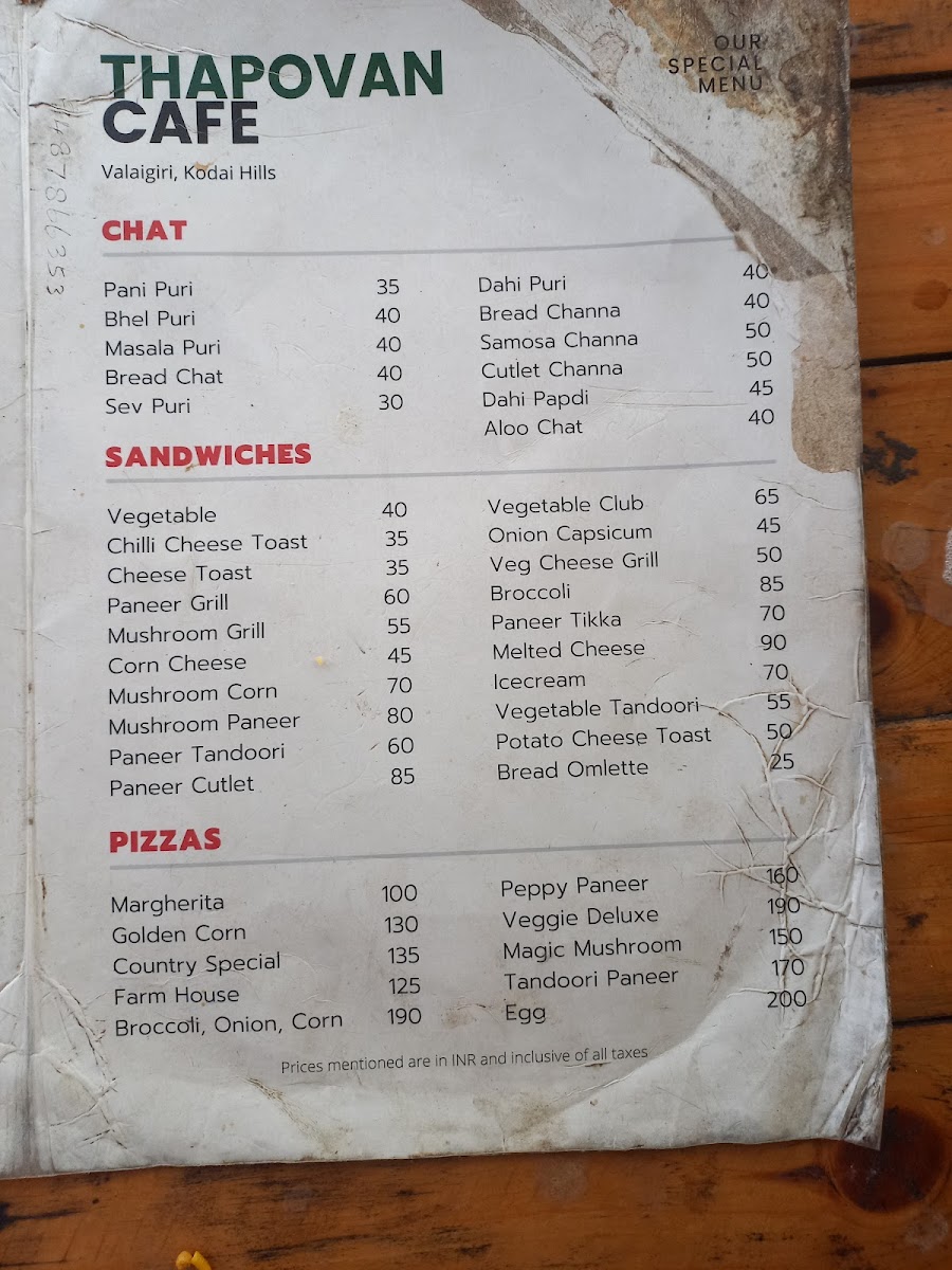 Welcome to Thapovan Cafe, a delightful stop nestled along the picturesque route from Kodaikanal to Batlagundu. This charming cafe, surrounded by serene forest landscapes, offers a soothing retreat for travelers seeking a break on their journeys.